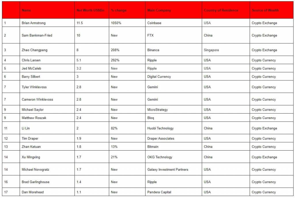 Armstrong’un net değeri geçen yıla göre %1.050 artarak 1 milyar dolardan 11.5 milyar dolara ulaştı. Sırasıyla, Zhao’nun net değeri 2020’ye göre “yalnızca” % 208 artarak 8 milyar dolara yükseldi. Hurun’un listesindeki diğer yeni üyeler arasında 3.2 milyar dolar ile beşinci sırada Ripple’dan Jed McCaleb, 3 milyar dolar ile altıncı sırada Digital Currency Group CEO’su Barry Silbert ve 2.8 dolarlık net değerle yedinci sırayı paylaşan Gemini kurucuları Tyler ve Cameron Winklevoss ikizleri yer aldı.